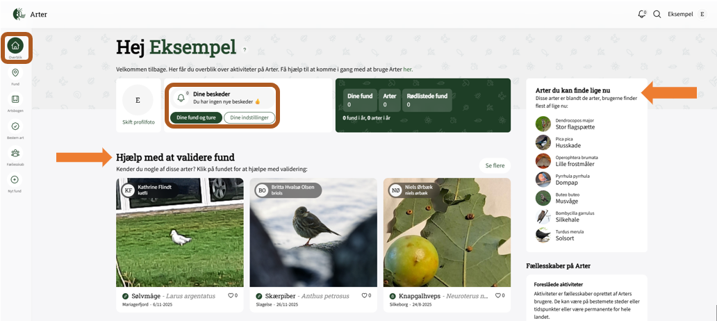 'Overblik' er den første side, du møder, hvis du er logget ind som bruger på Arter. Her kan du se din brugerstatistik, gå til dine egne fund og ture, se kommentarer og artsforslag til dine fund og nyheder fra aktiviteter, du følger (under Notifikationer) samt se andre brugeres fund, som du kan hjælpe med at artsbestemme og validere.