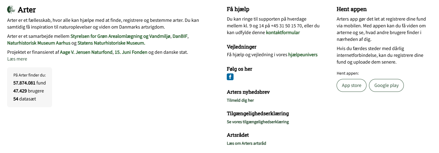 Nederst på Arters webside kan du se, hvem der præsenterer og hvem der støtter Arter. Du kan også hente Arters feltapp, finde vej til vejledninger og support, følge Arter på Facebook og se statistik om Arter.