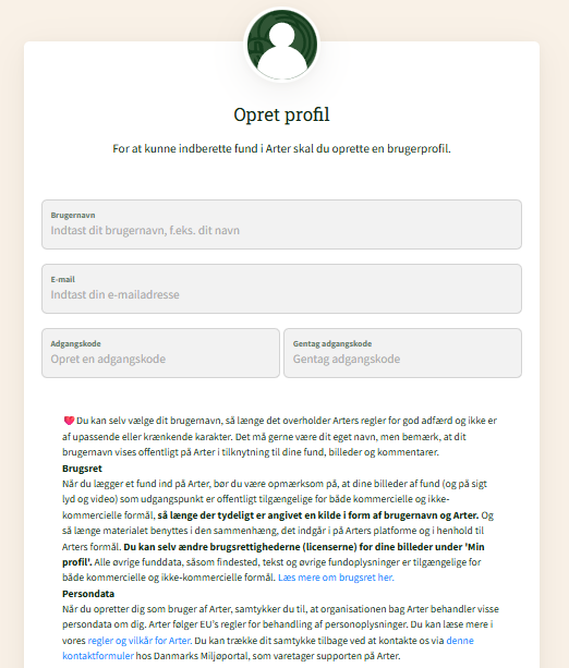 Du kan selv vælge dit brugernavn, så længe det overholder Arters regler for god adfærd og ikke er af upassende eller krænkende karakter. Det må gerne være dit eget navn, men bemærk, at dit brugernavn vises offentligt på Arter i tilknytning til dine fund, billeder og kommentarer.