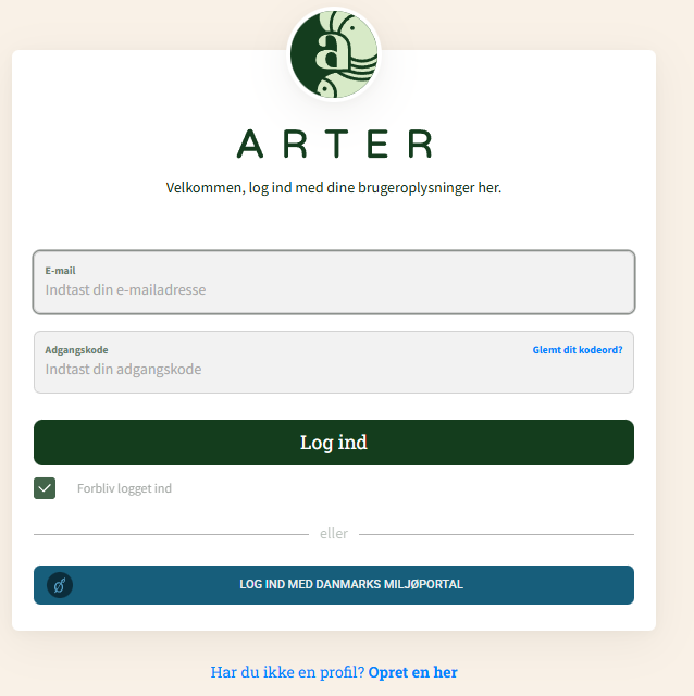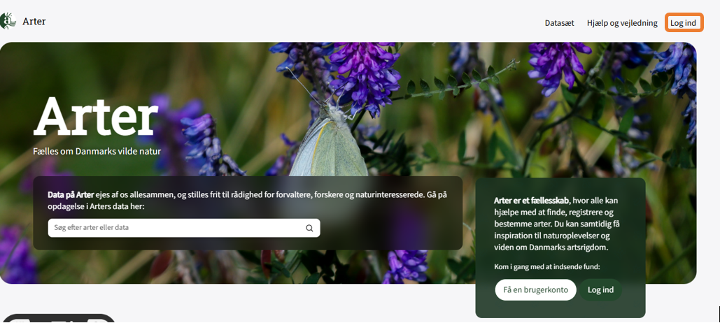 Når du er oprettet som bruger, kan du logge ind ved at klikke du på 'Log ind' i øverste højre hjørne på Arters webside.