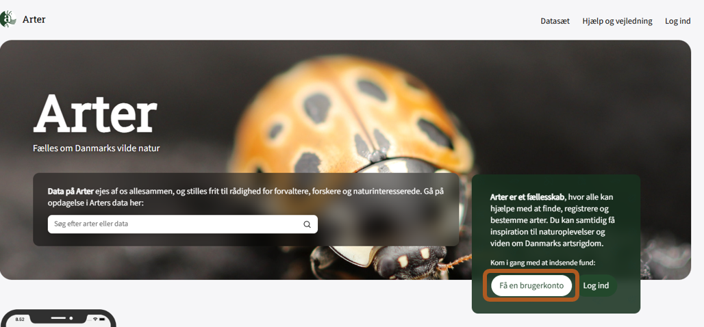 For at oprette dig som bruger på Arter skal du på forsiden klikke på 'Få en brugerkonto'.