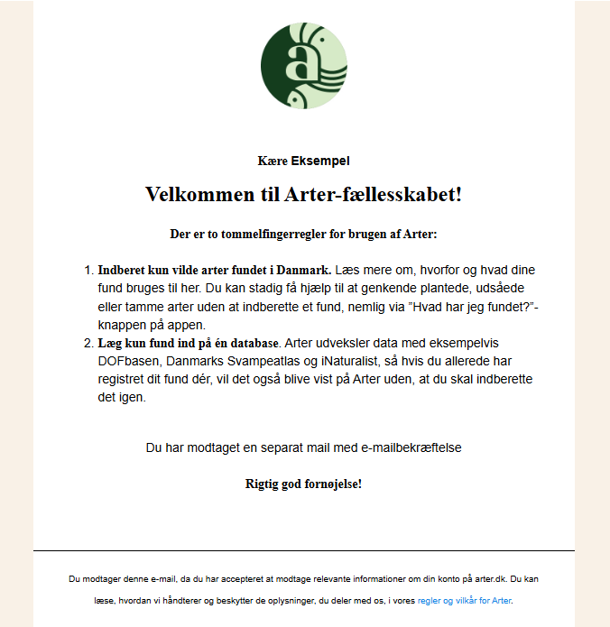 Bemærk! Hvis du ikke får bekræftet din e-mail med linket fra velkomstmailen, bliver din bruger ikke oprettet, og du kan derfor ikke logge ind på hverken Arter.dk eller appen 'Arter - Indberetning'.