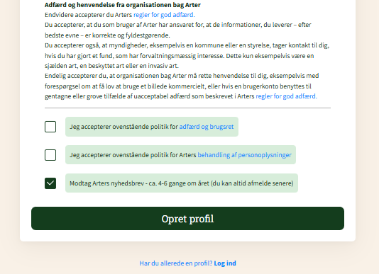Se her hvilke trin du skal igennem, når du opretter dig som bruger på Arters webside Arter.dk.