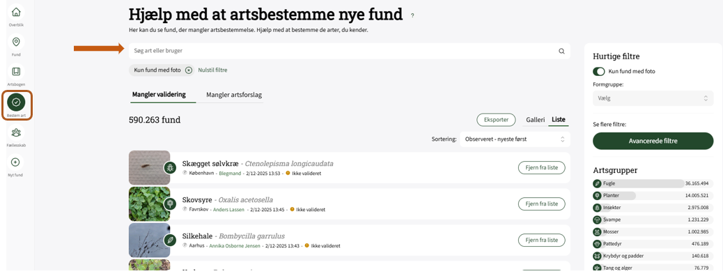 Under 'Bestem art' kan du vælge mellem fund, der mangler validering, og fund, der mangler forslag til art. Du kan vælge at få dit søgeresultat vist som Galleri eller som Fundliste - og du har adgang til forskellige filtre og sorteringer.