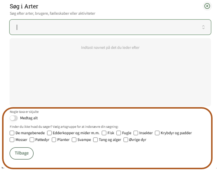 Du kan indsnævre din søgning til en enkelt artsgruppe, eller du kan vælge at medtage skjulte taxa ved at vælge 'Medtag alt'.
