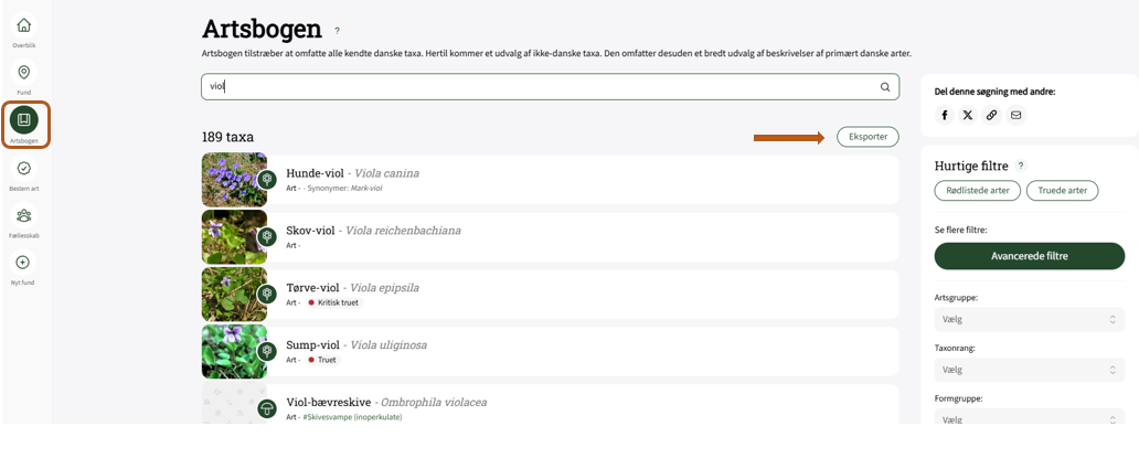 Når du søger i 'Artsbogen', viser søgeresultatet udelukkende information om taxa (arter, slægter, ordner mv.), men inde på det enkelte taxon kan du også se fund. Du har adgang til forskellige søgefiltre, både avancerede filtre og filtre til hurtige søgninger.