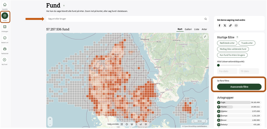 Søgeresultatet vises som udgangspunkt på et kort, men du kan også vælge at få fundene vist som Galleri, Fundliste eller Artsliste, og du har adgang til såvel avancerede filtre som filtre til hurtige søgninger.
