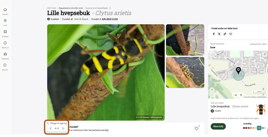 Når du efter en søgning har åbnet et fund på siden 'Fund' eller 'Bestem art', eller du har åbnet en taxonside i 'Artsbogen', behøver du ikke lukke fundet/taxonsiden for at få vist det næste på listen. I stedet kan du bladre frem og tilbage i listen ved brug af pilene under det åbne fund eller taxonside eller ved brug af piletasterne på tastaturet.